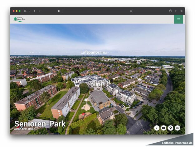Senioren-Park carpe diem, Oelde in 360° erleben Für den Senioren-Park carpe diem Oelde an der Hans-Böckler-Straße habe ich einen virtuellen Rundgang erstellt. 21 Panoramaansichten vermitteln einen detaillierten Einblick in die im November 2021 neu eröffnete Einrichtung. Vom Luftpanorama bis hin zum Wohnzimmer Der Rundgang startet mit einem animierten Luftpanorama, das einen ersten Eindruck von der